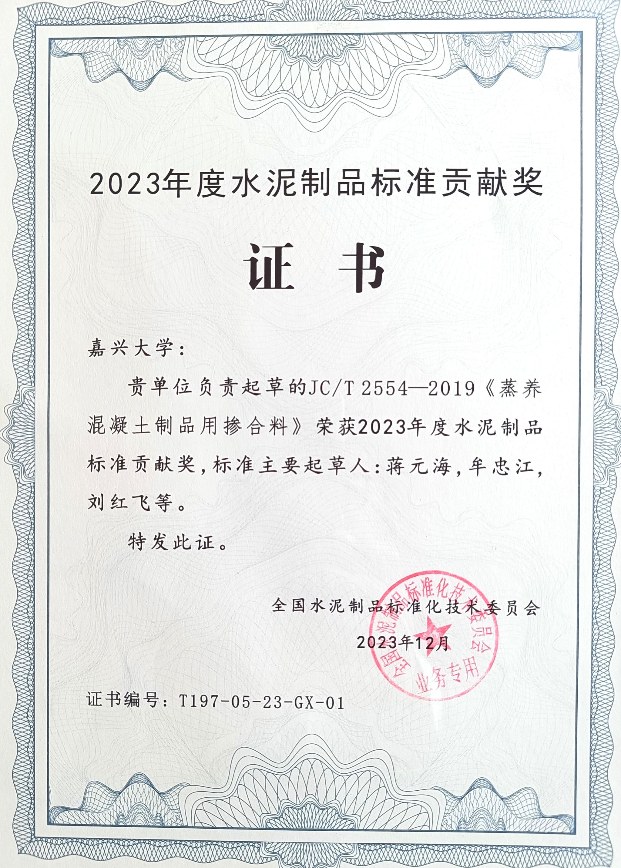 负责起草的《蒸养混凝土制品用掺合料》行业标准(JC/T 2554—2019)成果荣获标准贡献奖 ,蒋元海老师荣获标准化先进个人。
