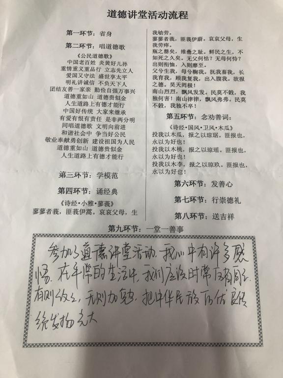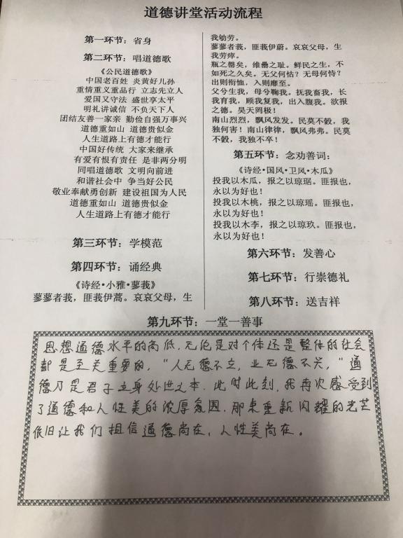 本次道德讲堂分为“省身”、“唱道德歌”、“学模范讲故事”、“诵经典”、“念劝善词”、“发善心”、“行崇德礼”、“送吉祥”、“一堂一善事”9个环节。