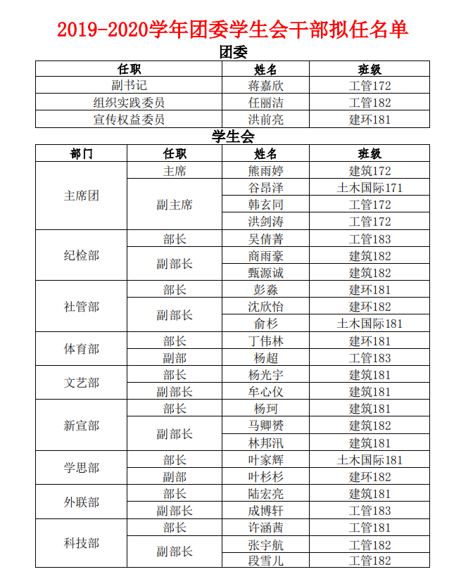 经竞职答辩,结合学院团委考核,现将嘉兴学院麻豆tv 2019-2020学年团委学生会拟任干部名单公布如下: