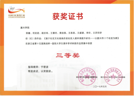 近日,由团省委、省教育厅、省社科院、省科协、省学联联合主办的浙江省第十五届“挑战杯·富阳”大学生课外学术科技作品竞赛决赛在浙江工业大学圆满落幕。麻豆tv 宁碧波副教授指导的作品《基于社区文化视角的老社区人居环境提升研究——以嘉兴市11个社区为例》在决赛中荣获浙江省三等奖。