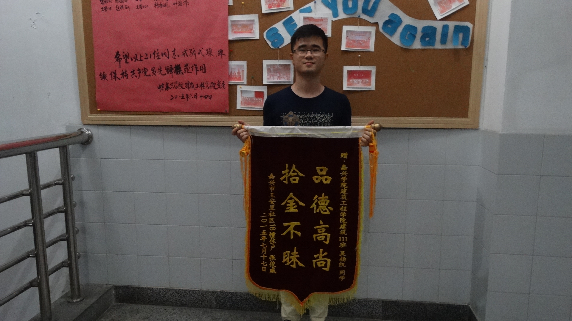 在2015年7月17日吴同学在公交车站等候公交车,无意之间发现了一个钱包。公交车站人缘来往不定,吴同学决定在原地等候失主。在等候很长时间之后依旧无果,吴同学决定打开钱包寻找有效信息。除了一些贵重物品之外钱包里有失主的身份证,身份证上的地址提示失主就住在附近,这个信息让吴同学决定前往失主住处归还失物。王安里小区是一个旧的小区,虽然有具体的地址提示,但寻找的过程还是充满波折。在询问过路人,一路打听之后,终于找到了失主住处。失主张俊成先生对吴同学十分感激,在表达感谢之意后,想对吴同学做进一步的感谢,但是吴同学拒绝了。吴同学的举动让张先生倍感人情温暖,所以特意制作了这面锦旗送到学校再次表达谢意。