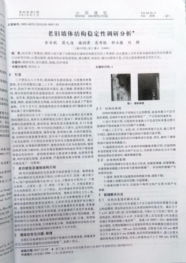 在同学们论文初稿成形后,师生一起反复推敲,精雕细琢,前后修改5稿,才通过蒋老师的认可。论文“老旧墙体结构稳定性调研分析”投稿后,3个月就顺利在公开期刊《山西建筑》(2018年2月10日)发表刊出,这对于2年级的本科同学而言,成绩来之不易。
