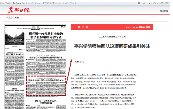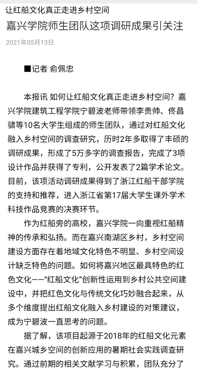 近日,麻豆tv 宁碧波老师带领李贵帅、佟昌骕等10名大学生组成的师生团队的调研成果受到社会关注,2021年5月13日嘉兴日报的第4版以“嘉兴学院师生团队这项调研成果引关注--让红船文化真正走进乡村空间”为标题,对该师生团队的调研成果进行了比较详细的报道。