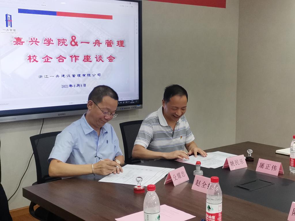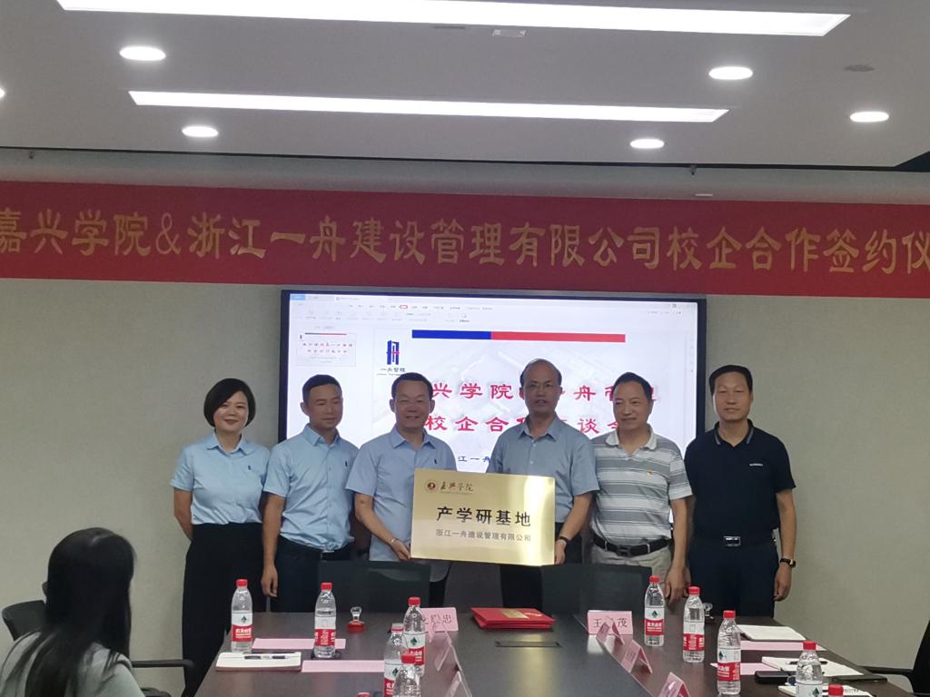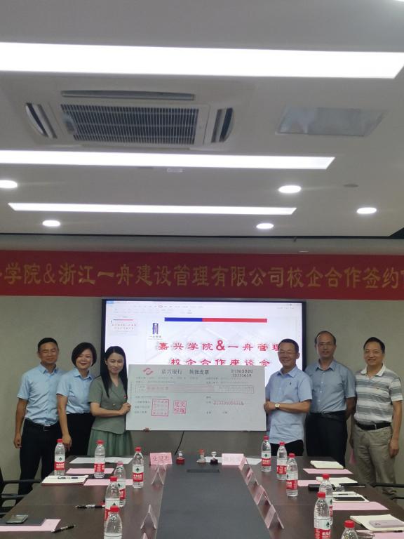 会上,殳耀忠总经理和王恩茂院长代表双方签订了校企合作协议;杨培强副校长向浙江一舟建设管理有限公司颁授产学研基地牌匾;殳耀忠总经理和姚民乐书记代表双方签订了捐赠协议,浙江一舟建设管理有限公司向嘉兴学院教育发展基金会捐赠叁拾万元用于学校的发展建设和人才培养。