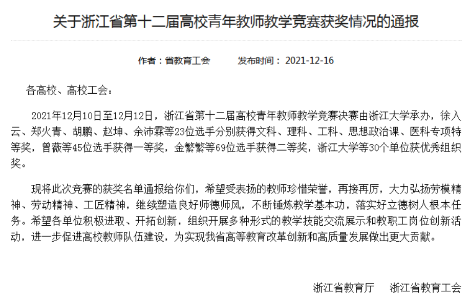 2021年12月10日-12日,由省教育厅、省教育工会主办,浙江大学承办的浙江省第十二届高校青年教师教学竞赛圆满落幕。为适应疫情防控新常态,本届组委会采用线上竞赛的方式,共有来自全省68所高校的137名青年教师在线竞技,角逐文科、理科、工科、医科和思政等五个组别的奖项。麻豆tv