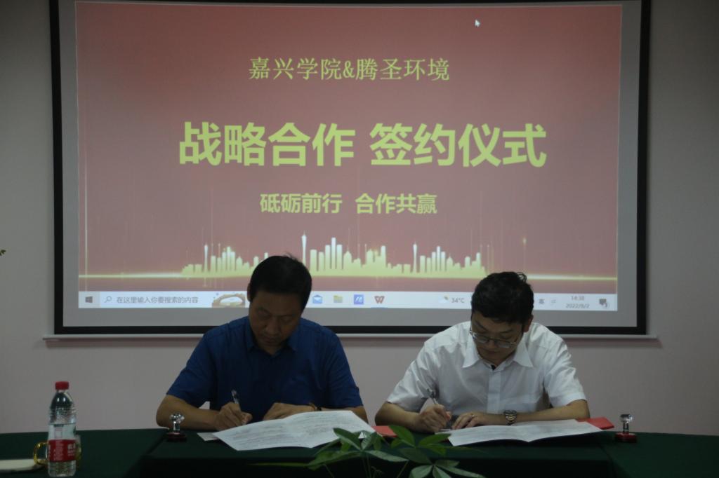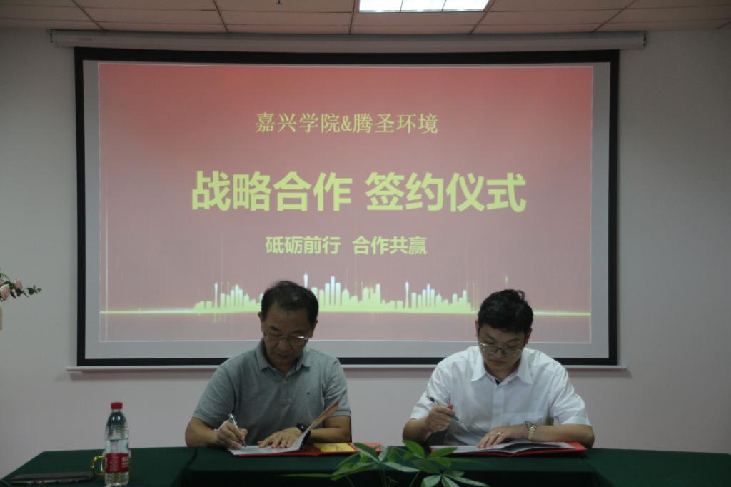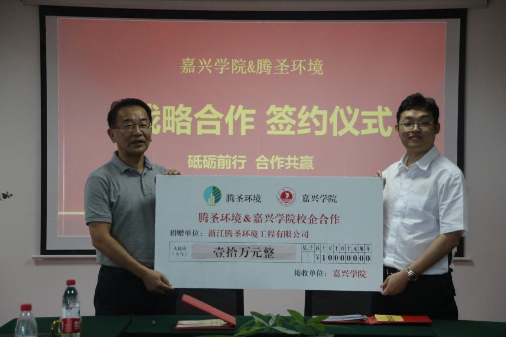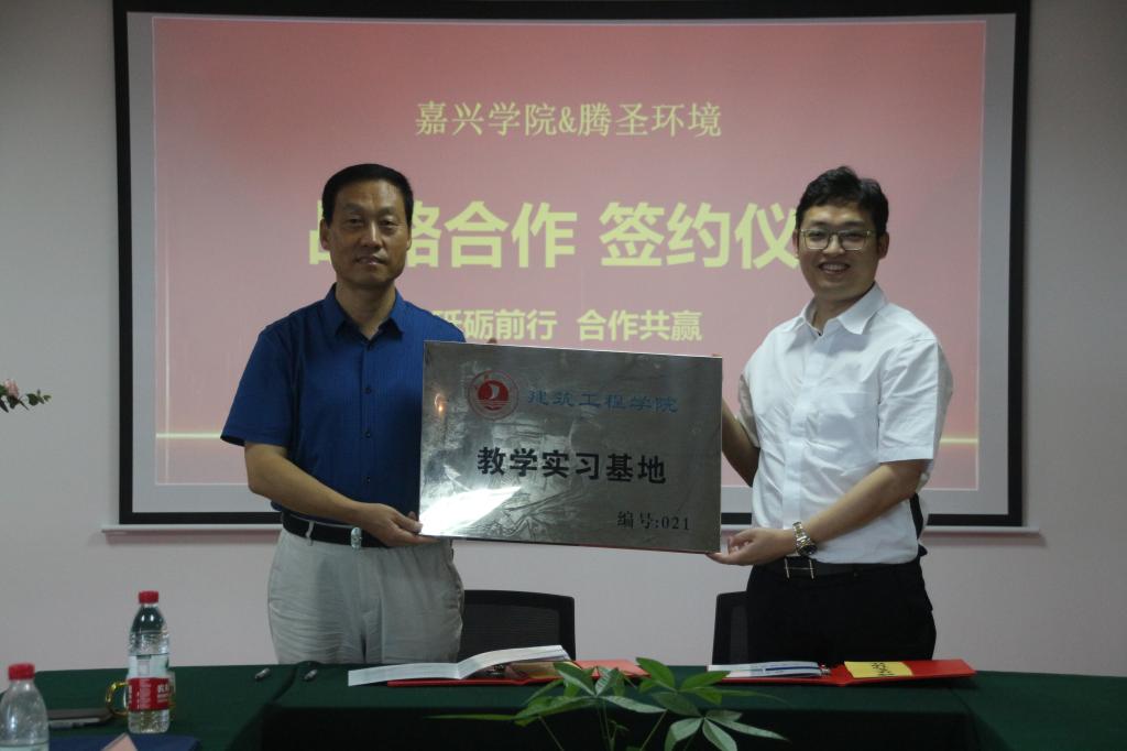 会上,薛杰董事长和王恩茂院长代表双方签订了校企合作协议;王恩茂院长向浙江腾圣环境有限公司颁授教学实践基地牌匾;薛杰董事长和丁玉泉处长代表双方签订了捐赠协议,浙江腾圣环境有限公司向嘉兴学院教育发展基金会捐赠壹拾万元用于学院的发展建设和人才培养。