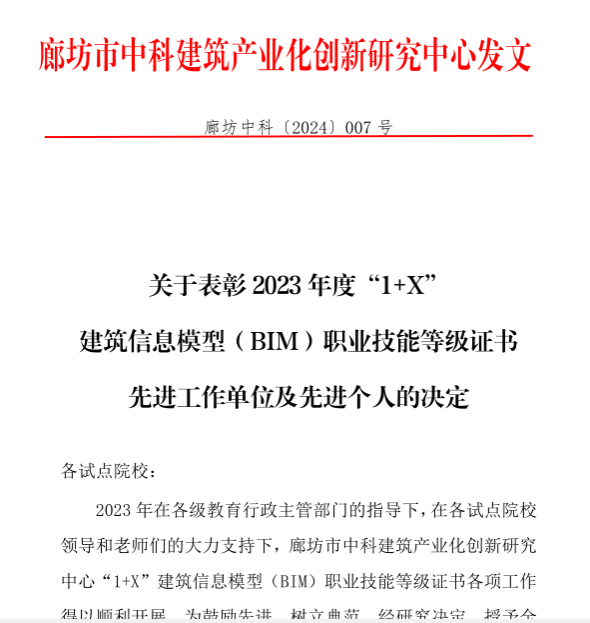 的“1+X(BIM)职业技能等级证书考核站点”荣获教育部2023年度"1+X"建筑信息模型(BIM)职业技能等级证书先进工作单位。廊坊市中科建筑产业化创新研究中心为教育部指定的“1+X”建筑信息模型(BIM)培训评价组织,近日发文授予麻豆tv
