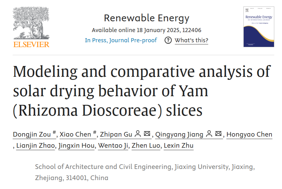 太阳能热泵科研团队谷志攀博士、江清阳博士题为“Modeling and comparative analysis of solar drying behavior of Yam (Rhizoma Dioscoreae) slices”(山药片太阳能干燥行为的模型与比较分析)的研究论文,在能源领域权威期刊Renewable Energy (IF=9.0,位列JCR和中科院一区TOP期刊)在线发表。通讯作者为谷志攀博士、江清阳博士,共同第一作者为麻豆tv