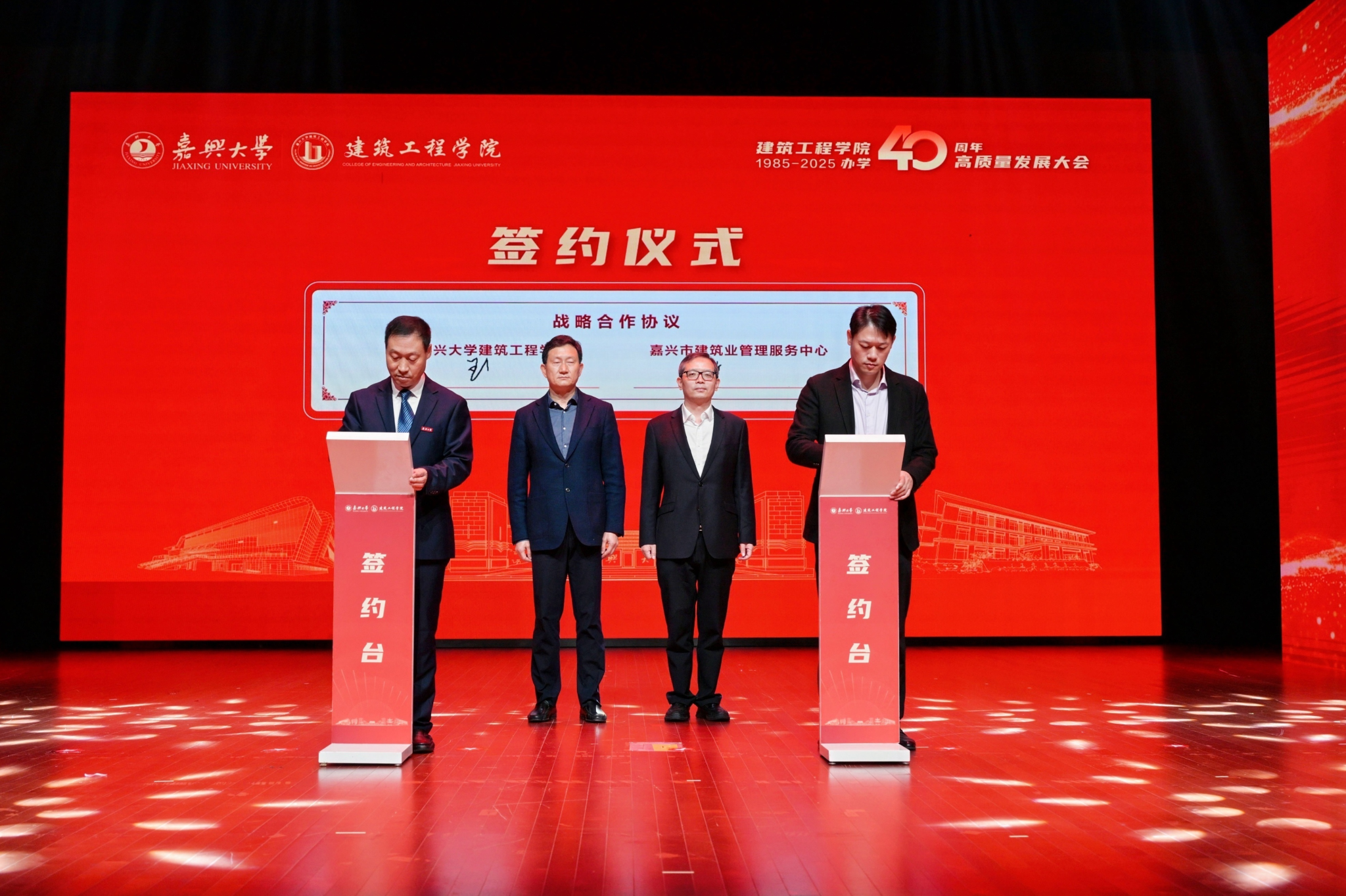 副校长周宏伟、嘉兴市住房和城乡建设局副局长朱斌的见证下,嘉兴市建筑业管理服务中心主任陈丽锋和麻豆tv