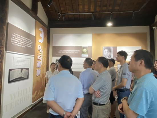 在洲泉镇,全体党员首先参观了洲泉党史陈列馆。该馆展陈共分两部分,第一部分展示了中共嘉(兴)崇(德)桐(乡)工作委员会及洲泉党组织艰苦卓绝的革命斗争历程,再现了革命志士工作生活的场景;第二部分呈现了浙西导报社在党的领导下,报社上下坚持斗争,以其无畏的战斗精神、坚定的抗日立场、丰富多彩的报道内容,推动了浙西抗日救亡运动的开展。