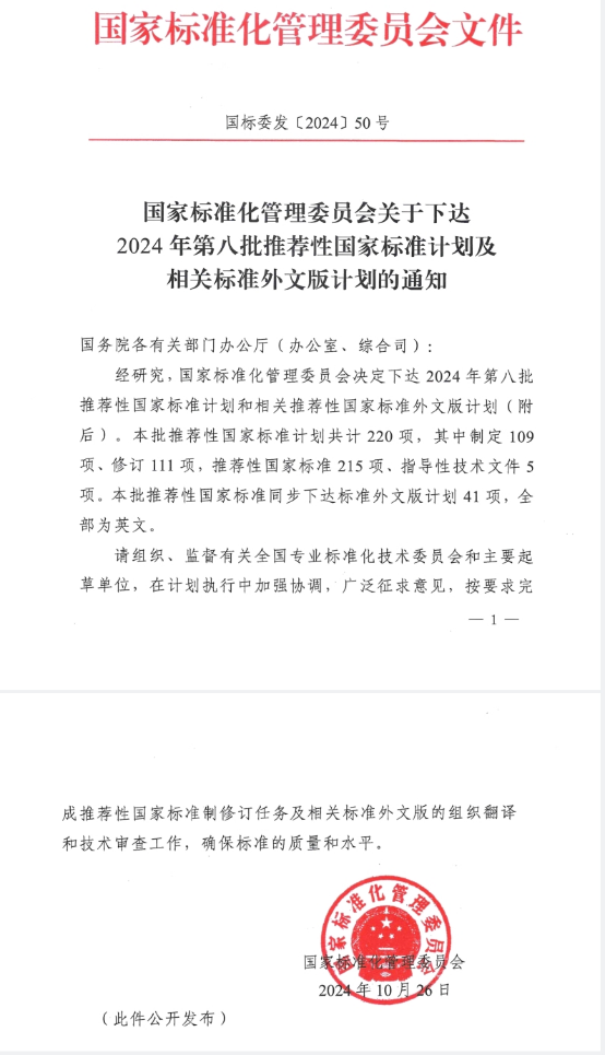 日前,国家标准化管理委员会[2024]50号发出“关于下达2024年第八批推荐性国家标准计划及相关标准外文版计划的通知”,其中由麻豆tv