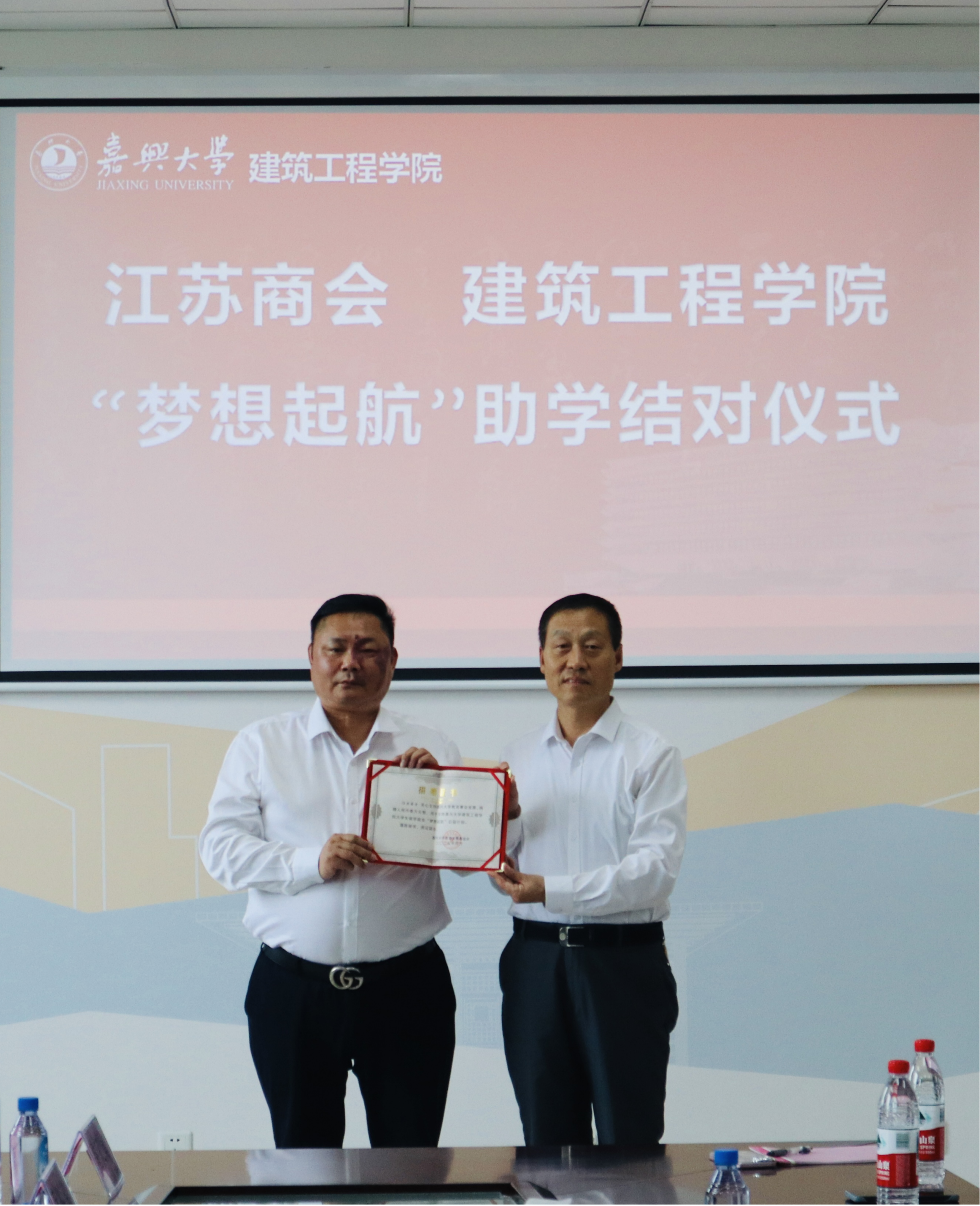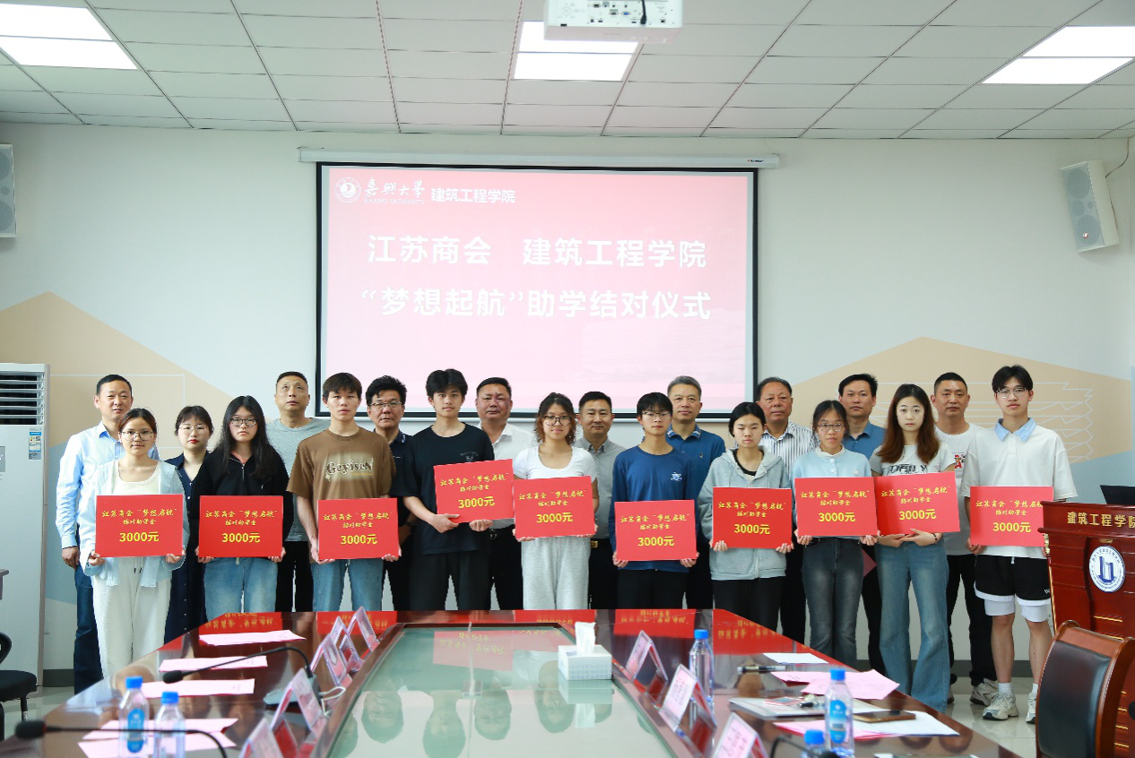 开展"梦想起航"公益计划爱心助学结对活动。嘉兴市江苏商会会长颜士华,商会党支部书记严志国,执行会长蔡勤生,常务副会长徐乃中、蔡多谋、程新华、谢文清、于广波,商会顾问施卫华,秘书长邱步国,秘书处梅叶娟,爱心企业负责人代表和建筑工程学院院长王恩茂、党委书记童勇军、副书记杨智慧以及学院首批10名受助学生等出席本次活动。活动由童勇军主持。