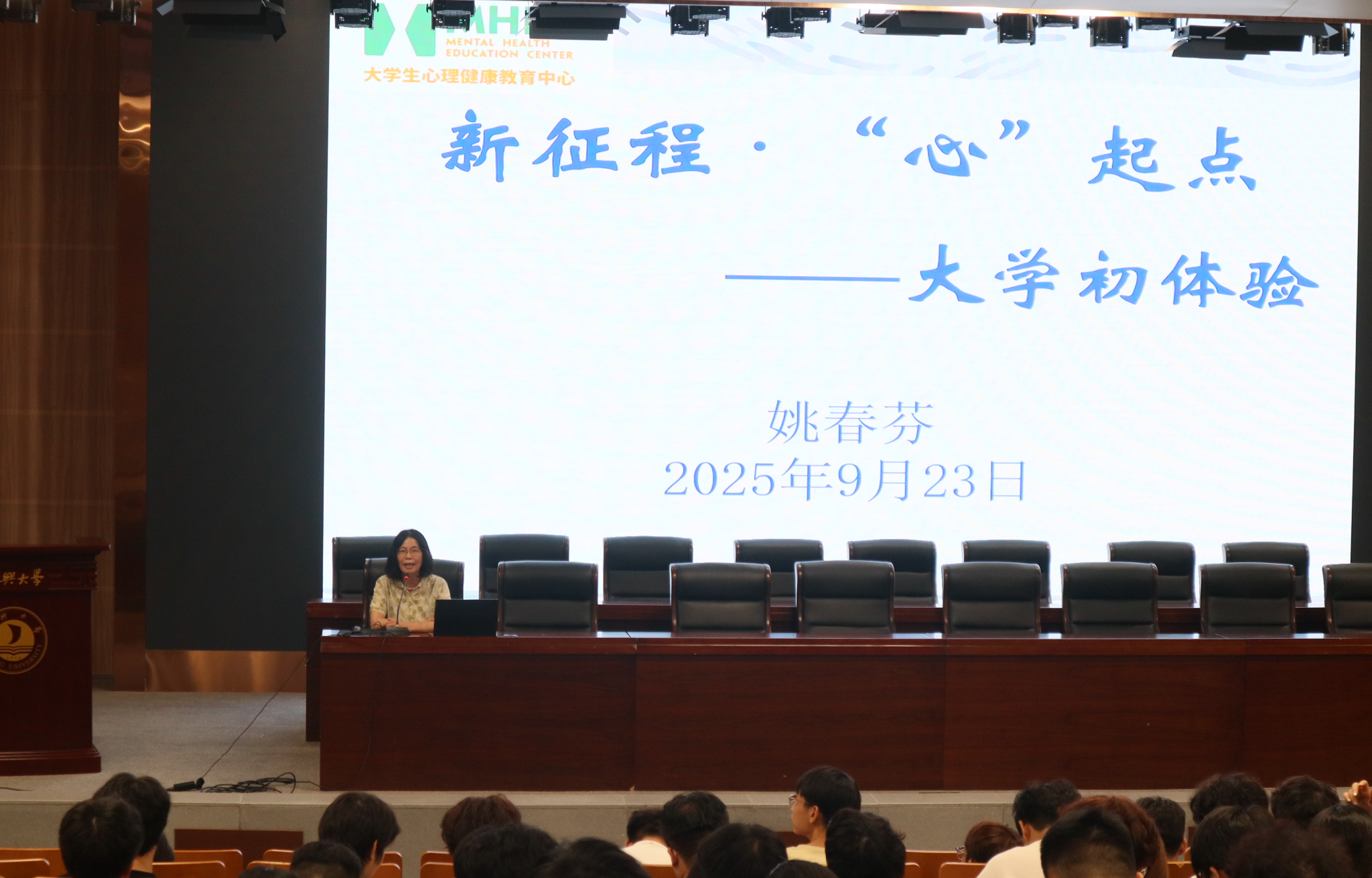 典礼之后,心理健康教育中心姚春芬老师为新生带来了心理适应专题讲座。围绕“心理适应”这一核心主题,姚老师从“环境适应、学业适应、人际适应、情绪管理、自我认同”五大维度展开深入讲解。她结合大量真实案例,剖析了新生常见的心理困扰,如“孤独感”“迷茫感”“比较焦虑”“时间管理混乱”等,并提出科学、实用的应对策略。