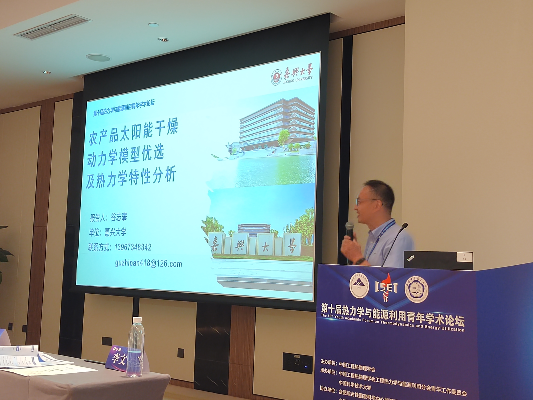 会议期间,谷志攀老师与侯景鑫老师认真聆听了大会报告,并就热力学与能源利用方面的研究热点,与国内众多青年学者进行交流探讨。谷志攀老师受邀在基础热力学分会场作题为《农产品太阳能干燥动力学模型优选及热力学特性分析》的学术报告。针对鲜贮农产品易腐损问题,研究团队构建了太阳能干燥装置,以山药为对象系统开展薄层干燥动力学分析。通过优选薄层干燥模型,采用拉普拉斯变换方法计算有效水分扩散系数,并基于Eyring-Polanyi方程解析活化能、焓变、熵变、吉布斯自由能变等热力学参数。该研究为农产品太阳能干燥提供了理论完善、方法创新的技术支撑,得到了分会场点评专家的好评,并引发了参会代表对本研究课题的兴趣与关注。谷志攀老师同时在分会场介绍了麻豆tv